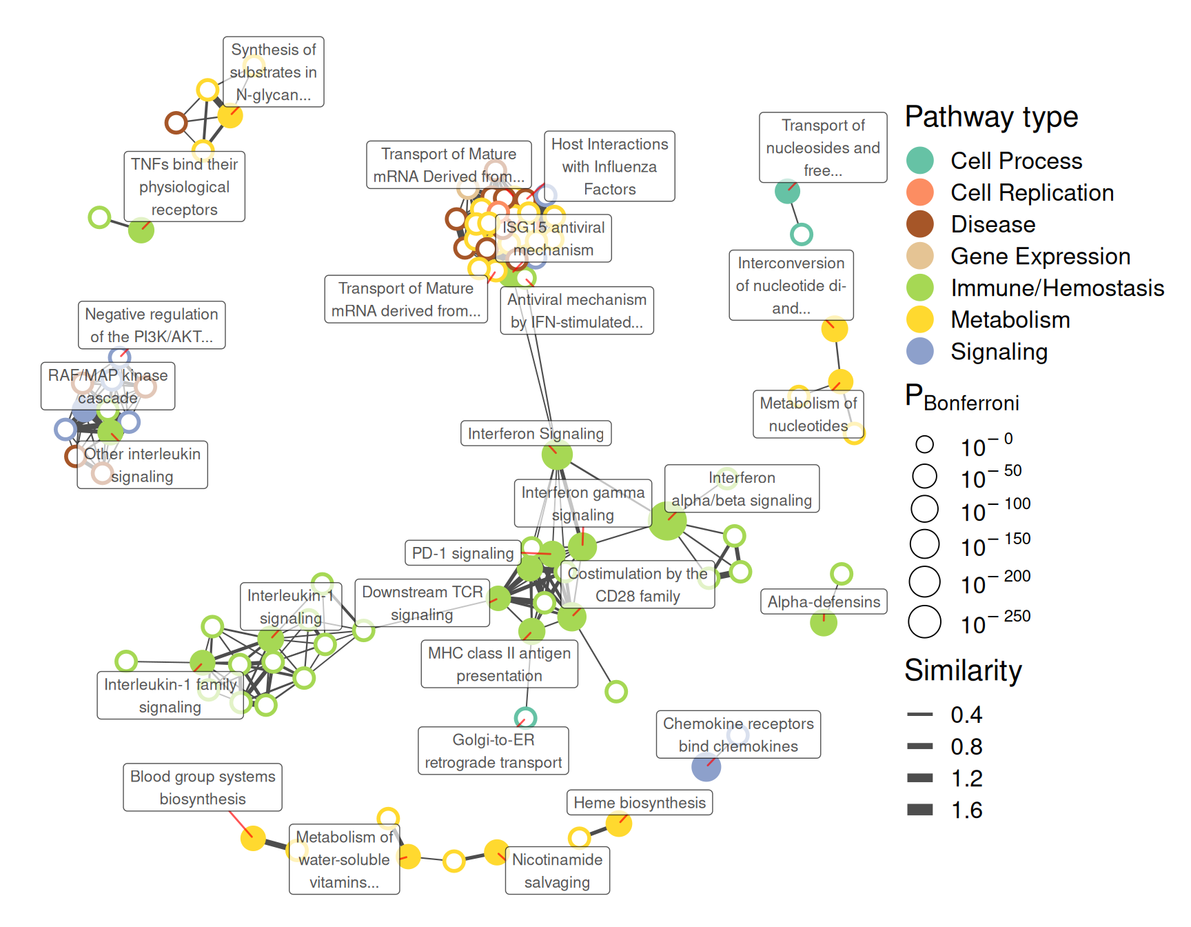 Nodes (pathways) which are filled in are enriched pathways (i.e. those output by pathwayEnrichment()). Size of nodes is correlated with statistical significance, while edge thickness relates to the similarity of two connected pathways.