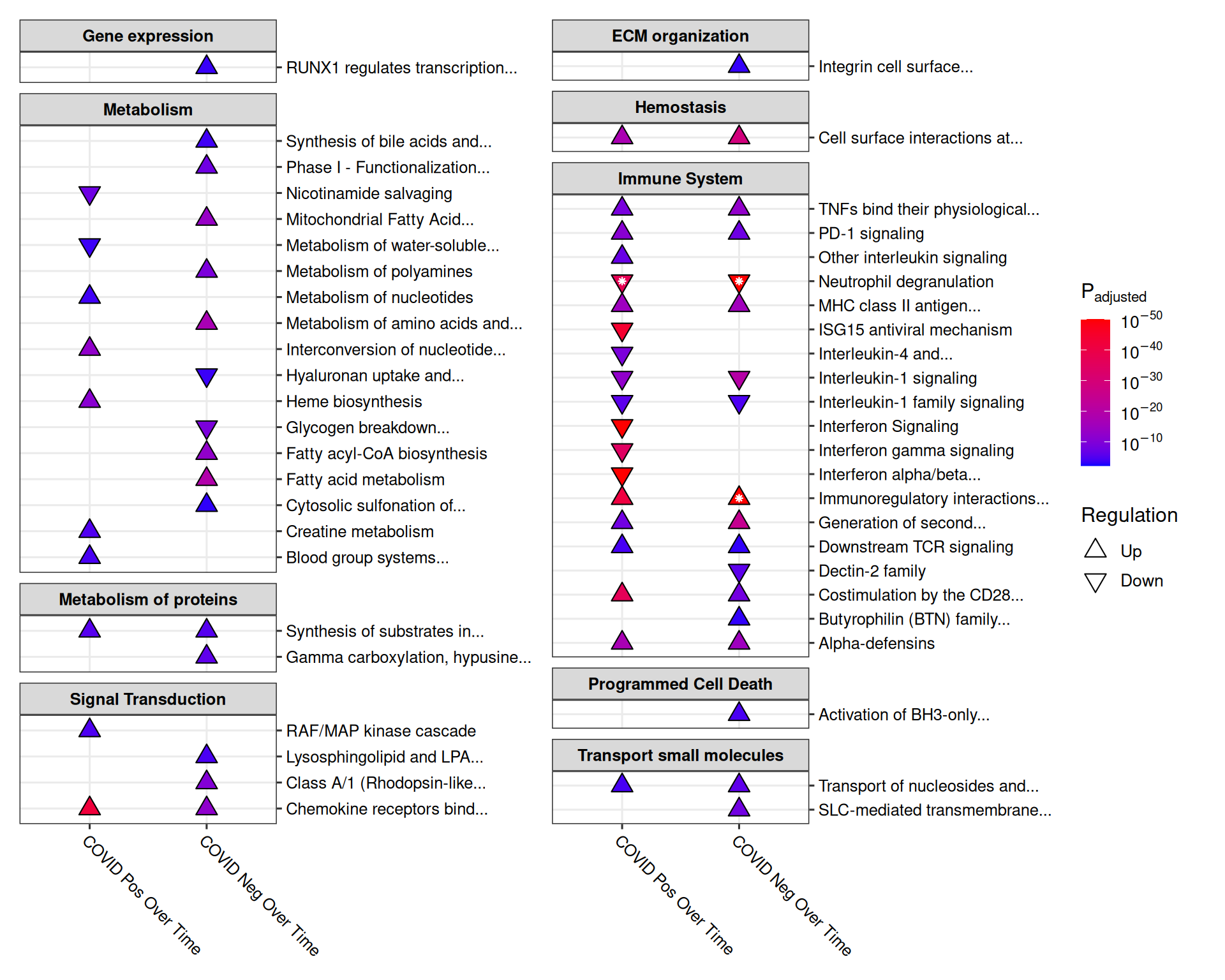 | COVID Pos Over Time | Up | R-HSA-202424 | Downstream TCR signaling | 2.7e-06 | 0.0003352 | 18 | 442 | 0.0407240 | 1687 | Immune System |