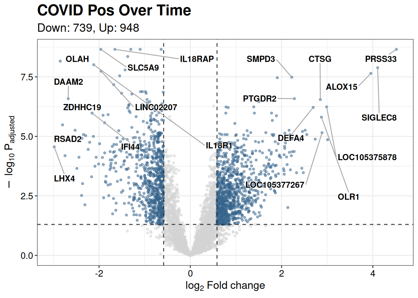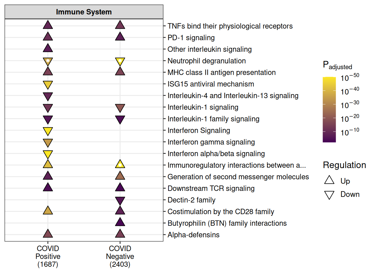 | COVID Pos Over Time | Down | INTERFERON GAMMA RESPONSE | INTERFERON GAMMA RESPONSE | 0.0000000 | 0.0000000 | 64 | 231 | 0.2770563 | 1687 | Immune |