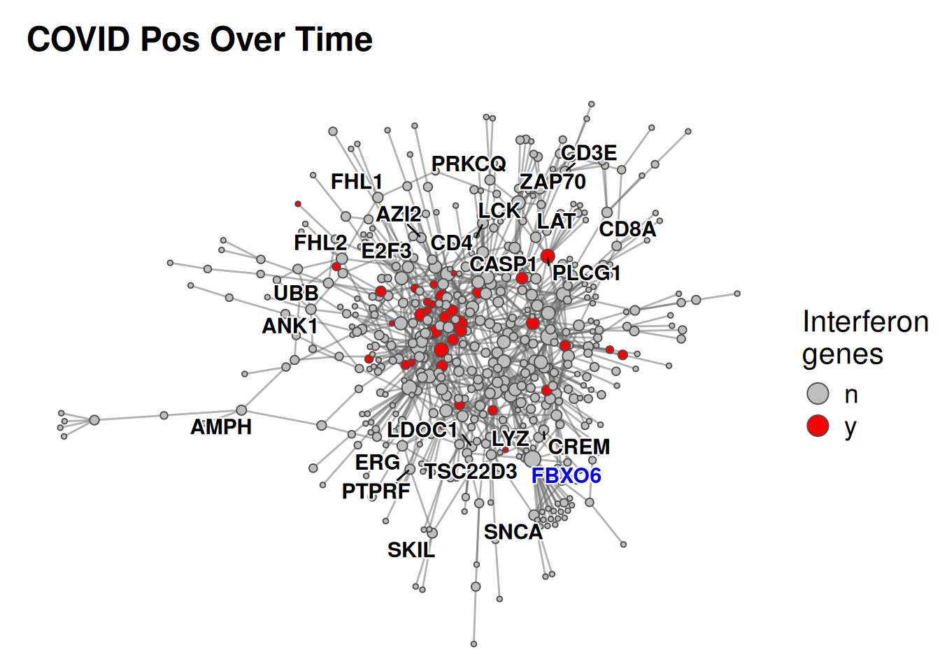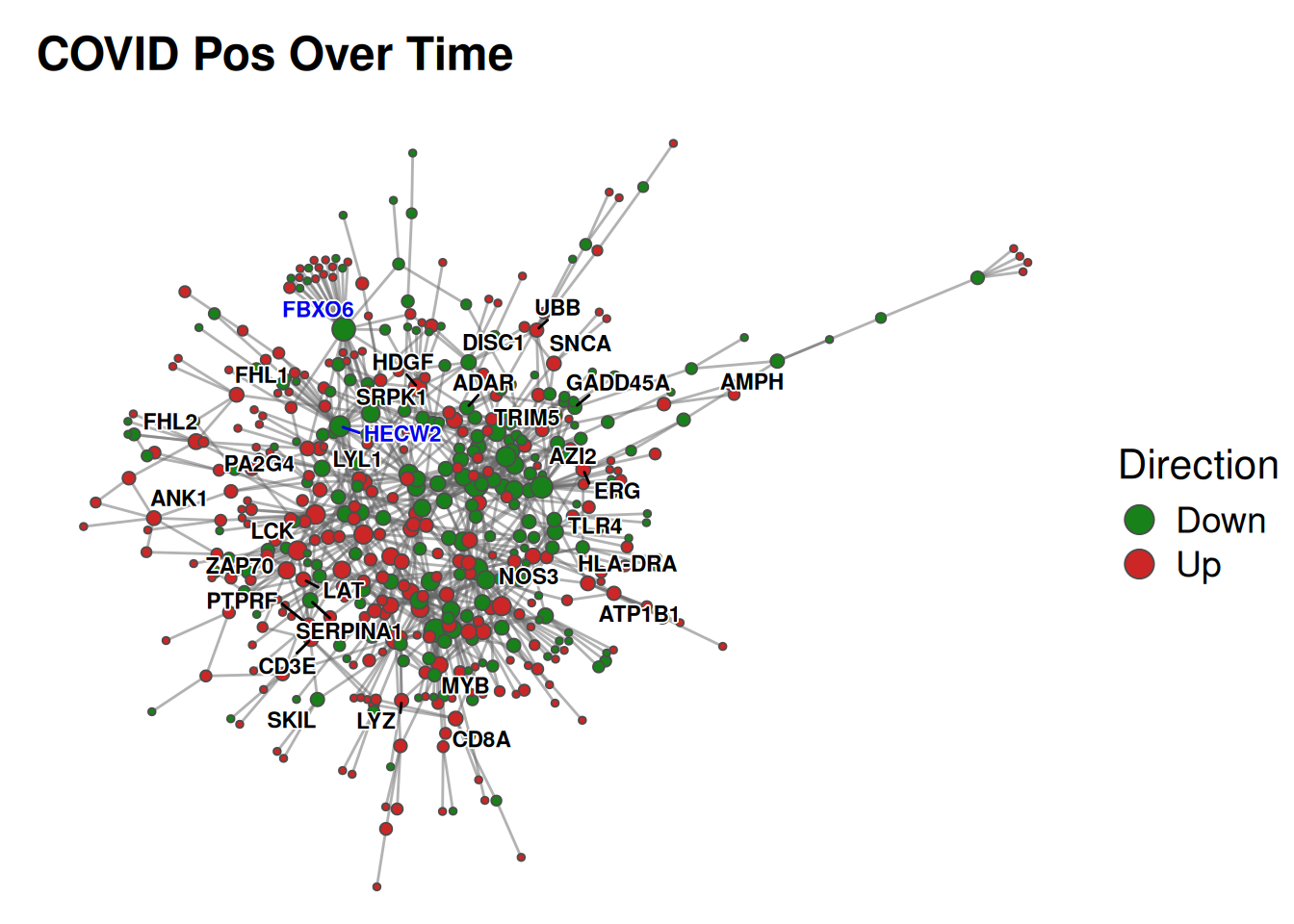 Let’s continue looking at the DEGs from the COVID positive patients over time, using the significant DEGs to build a PPI network. Since the data frame we’re inputting includes all measured genes (not just the significant ones), we’ll use the filterInput=TRUE option to ensure the network is made only with those genes which pass the standard thresholds (defined above). Since we’re visualizing a network of DEGs, let’s colour the nodes to indicate the direction of their dysregulation (i.e. up- or down-regulated) by specifying fillType="foldChange".